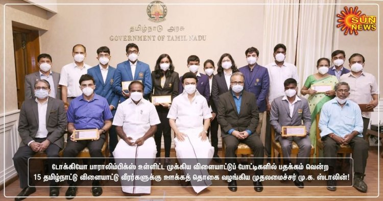 Chennai, 7th October 2021: Hon'ble Chief Minister of Tamil Nadu Thiru. M.K. Stalin awarded 2 Crore Rupees Cash Prize to Paralympics Tokyo 2020 Silver Medallist & High Jumper T. Mariyappan, and Athletics Coach Sh. Satyanarayana has accompanied him on the occasion. Mr. Mariyappan expressed his Joy for getting the award and said Government of Tamil Nadu is supporting Sports Development in the State, and sportsmen should utilise it and make proud and bring glory.